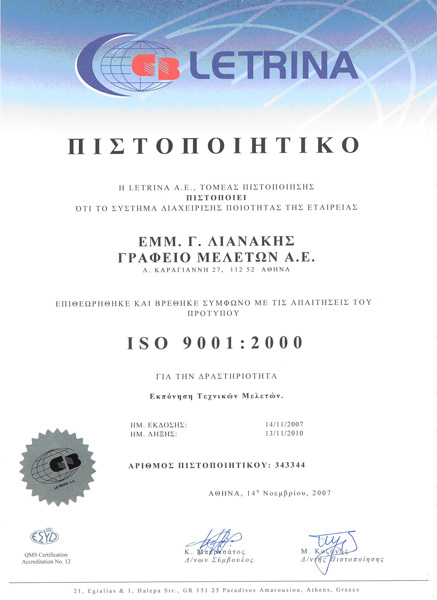 Η εταιρία ΕΜΜ. Γ. ΛΙΑΝΑΚΗΣ ΓΡΑΦΕΙΟ ΜΕΛΕΤΩΝ Α.Ε έχει βασική επιδίωξη την παροχή αξιόπιστων υπηρεσιών σύμφωνα: